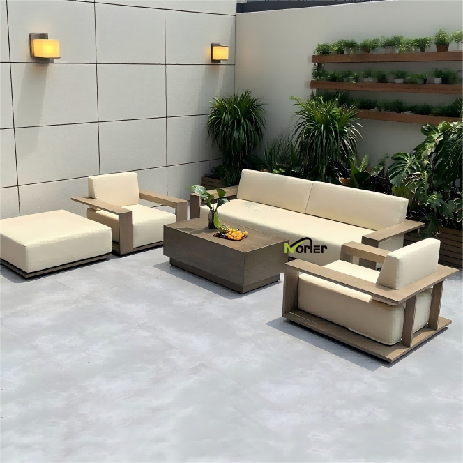 5. Teakhouten buitenbank: Deze bank is gemaakt van zeer weerbestendig natuurlijk teakhout, heeft een fijne nerf, hoge stabiliteit en ontwikkelt een luxer gevoel bij gebruik, waardoor het een klassieke keuze is voor het creëren van een luxe balkon in resortstijl.