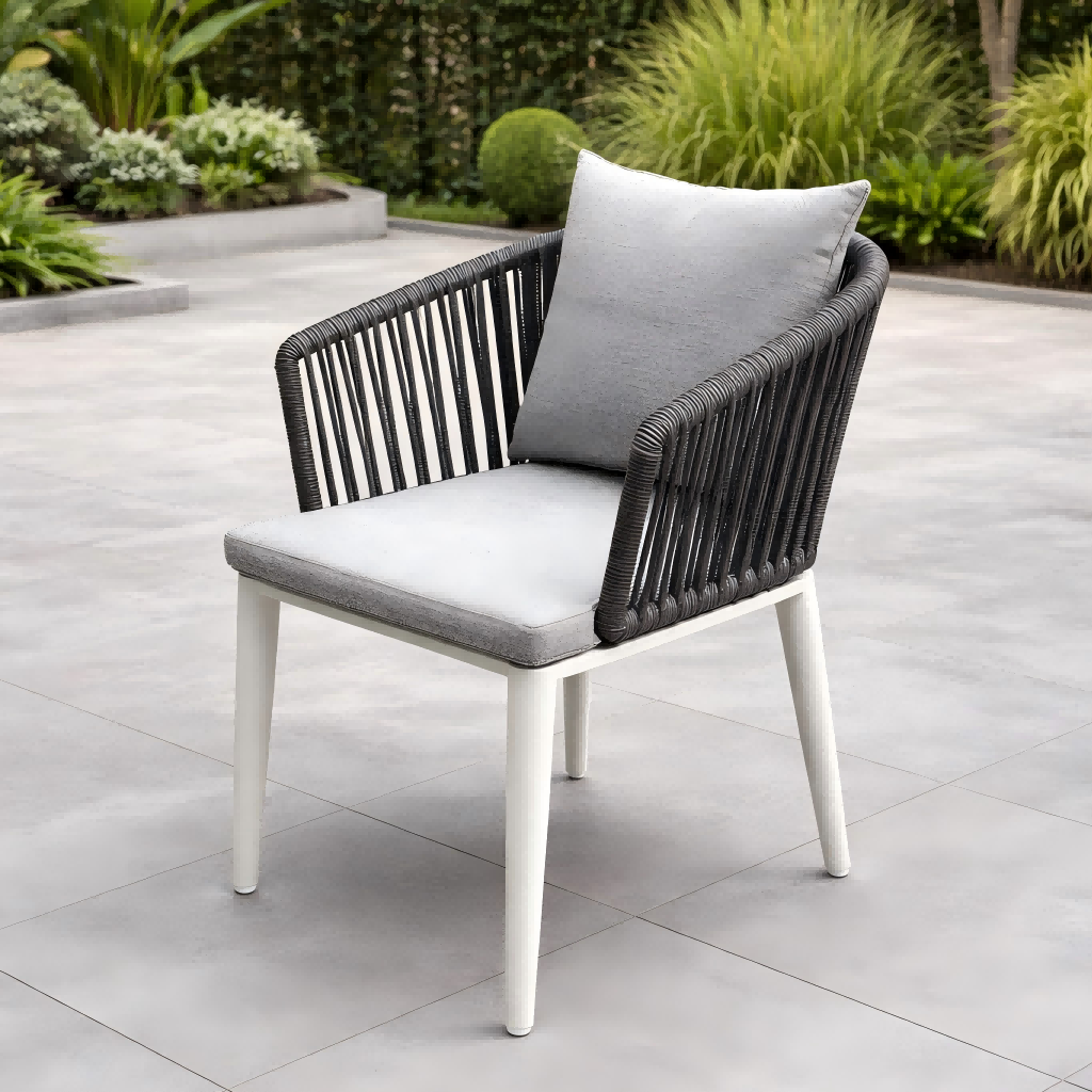 De eetkamerstoelen zijn voorzien van een touwgeweven rugleuning, waardoor een moderne en elegante uitstraling ontstaat en tegelijkertijd comfortabele ondersteuning wordt geboden. Het frame is gemaakt van gepoedercoat aluminium, wat uitstekende weerstand biedt tegen roest en weersomstandigheden buitenshuis.