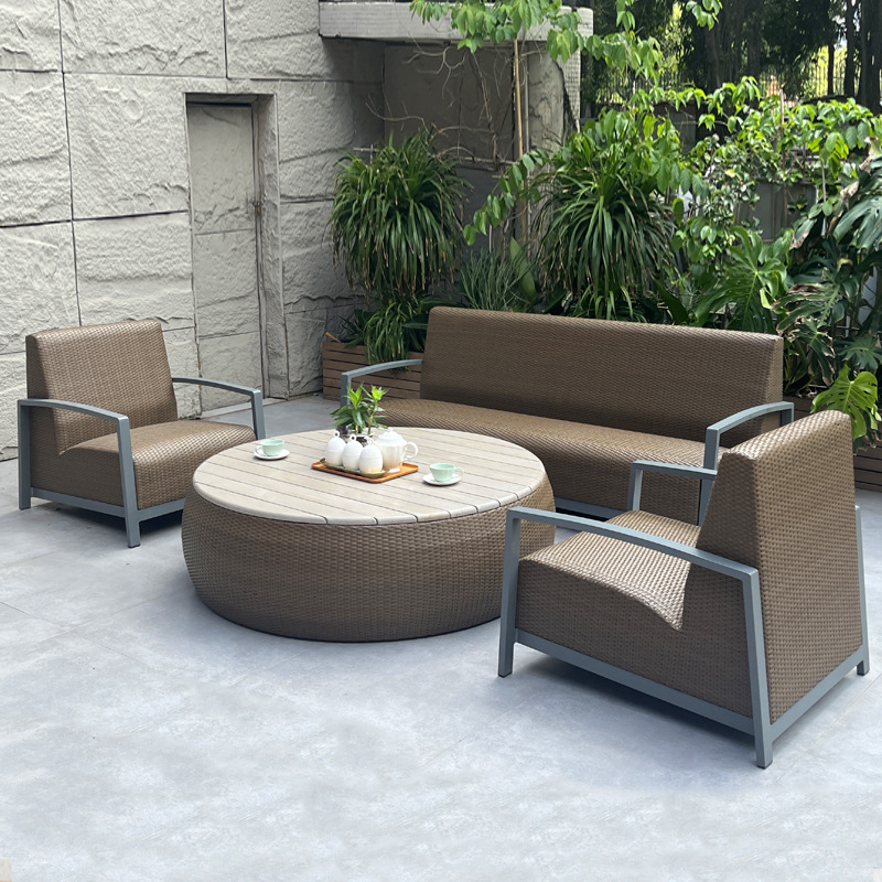 Salontafels van natuurlijk teakhout complementeren de zitbanken perfect, hun warme textuur en verfijnde stijl maken van elke koffiepauze een heerlijk ritueel. ☕